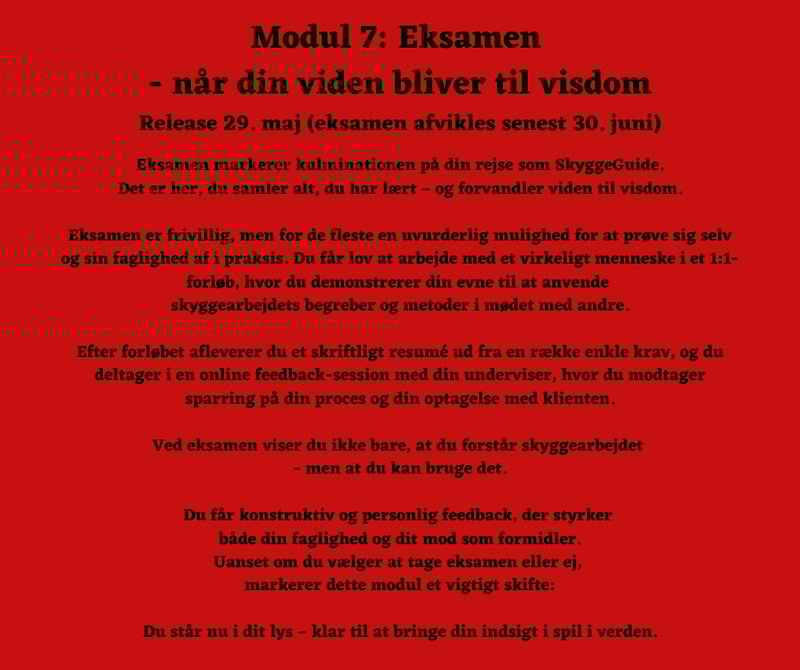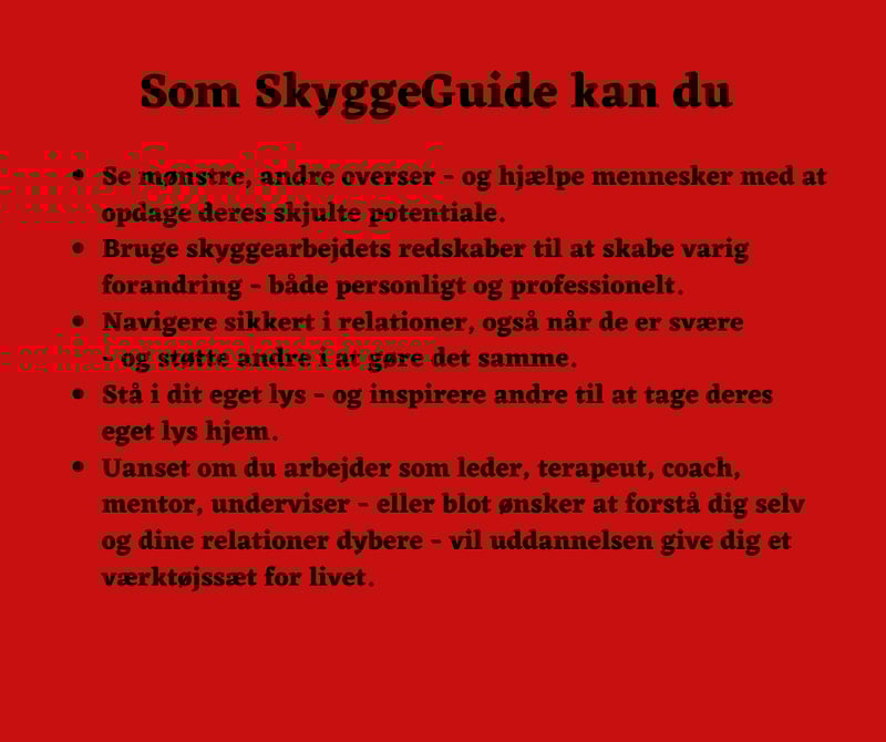 Med uddannelsen til SkyggeGuide står du stærkt, rodfæstet og autentisk - med en solid faglig ballast og et personligt mod, der gør dig i stand til at møde mennesker dér, hvor de er.